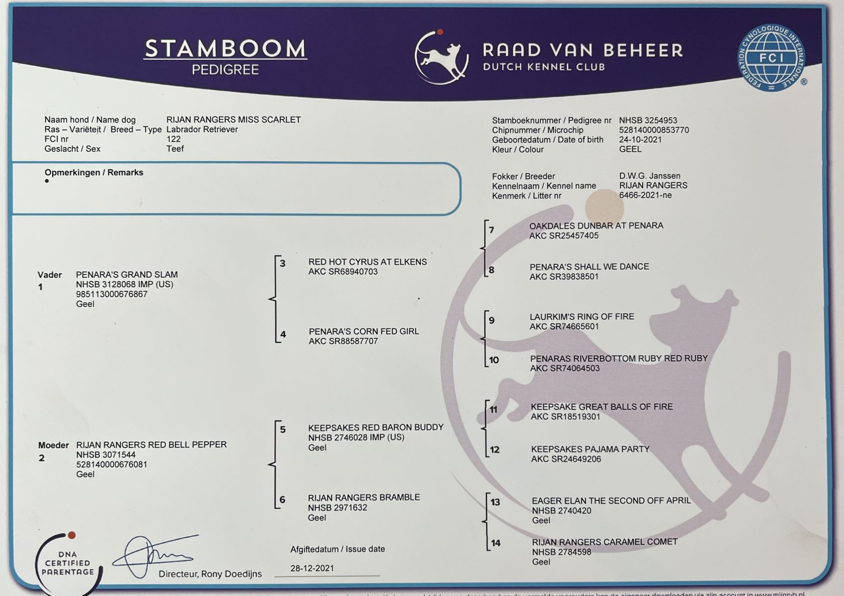 RiJan Rangers Miss Scarlett, geboren in 2021, dochter van mijn prachtige reu Rizzo (Penara’s Grand Slam) Zij heeft zijn mooie type en bone georven. Evenals zijn intelligentie.