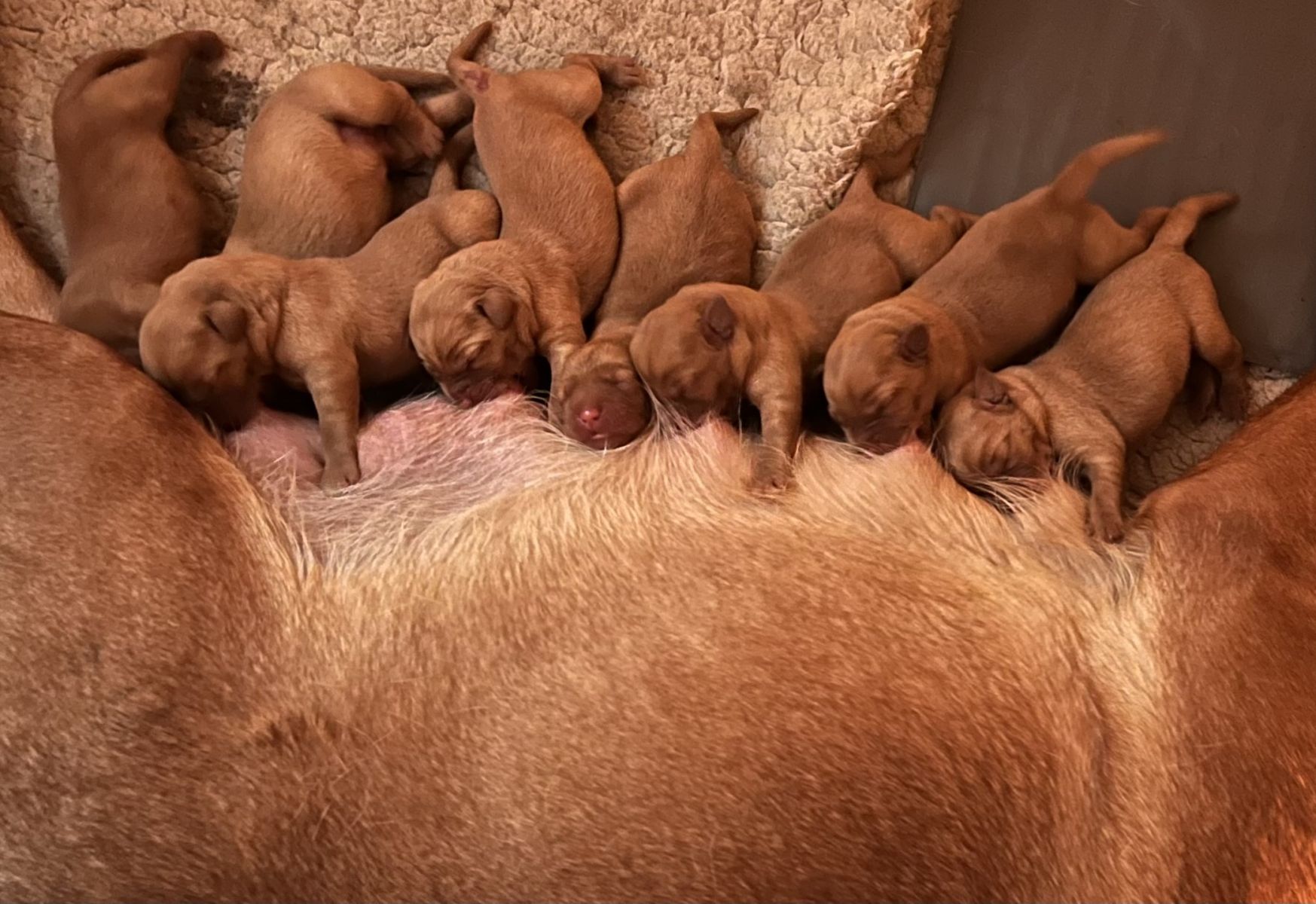 Cleo is mijn zesde generatie foxred labradors. Mijn eerste was Silronray’s Foxglove, geboren in 1992. In de jaren ‘90 waren er zo weinig foxred labjes dat er geen partner te vinden was met dezelfde kleur. Toch vond ik het een opdracht om deze originele en mooie warme kleur niet verloren te laten gaan. De derde generatie was een combi foxred (Sunny) met zwart. Daar hield ik een zwart teefje van aan (Viva). Met haar kon ik een nestje fokken met Buddy, de mooie en brave foxred reu van Sylvia Hansen. Met hun foxred dochter Christie heb ik deze lijn voortgezet.