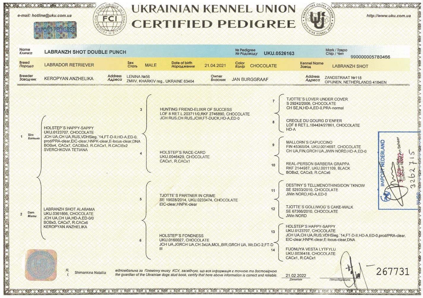 Hierboven de stamboom van de vader. HD-A, ED-vrij,ECVO - vrij DNA- alles vrij